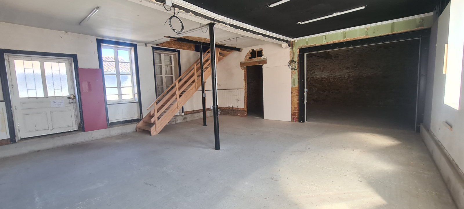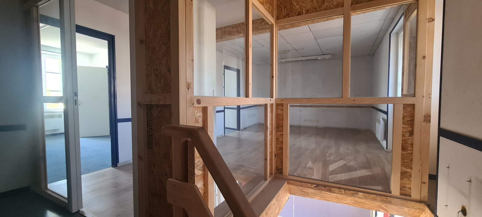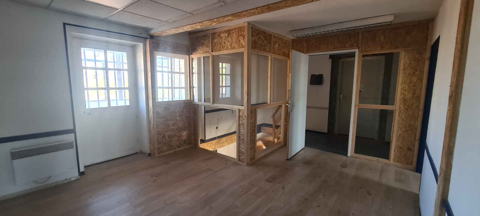 A l'étage le local se compose de deux bureaux, d'une pièce de repos, d'une salle d'eau et de réserves.
