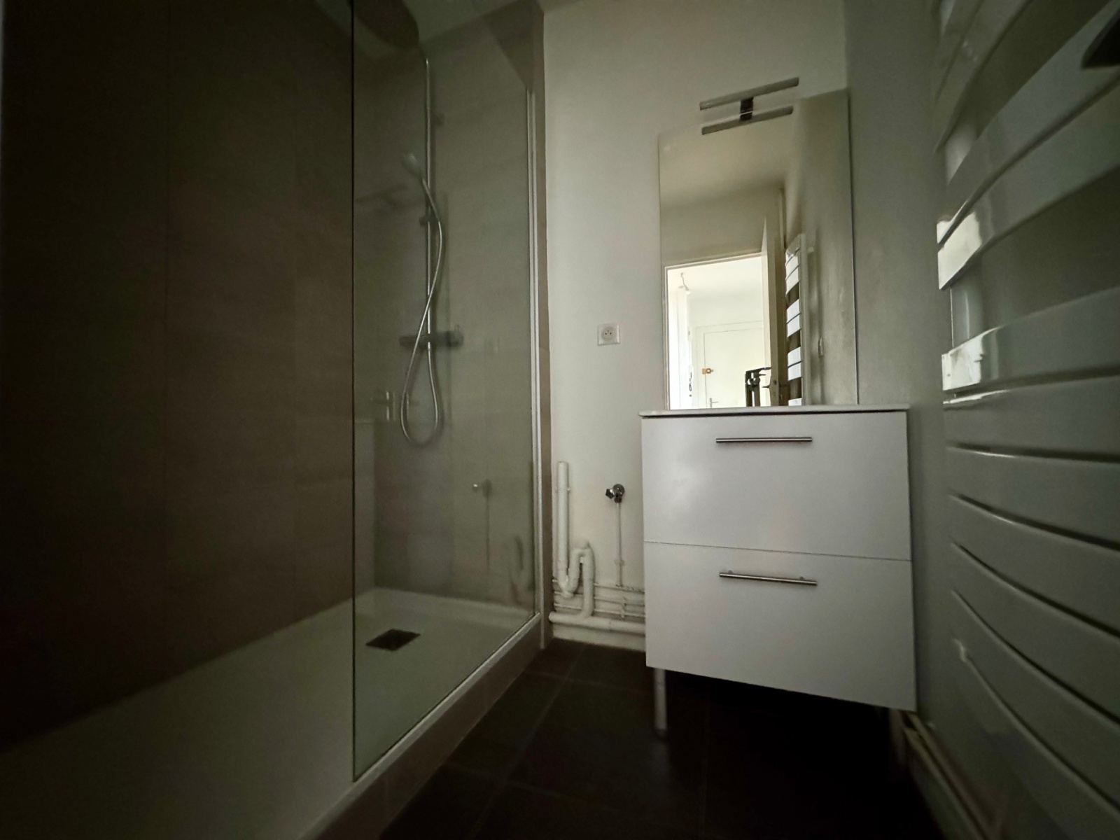 Il bénéfie d'un séjour très agréable et lumineux avec de nombreux rangements et d'une cuisine complètement aménagée et équipée. La chambre donnant sur l'arrière est au calme et la salle d'eau est très agréable grace à sa douche à l'italienne. Les WC sont séparés de la salle d'eau.