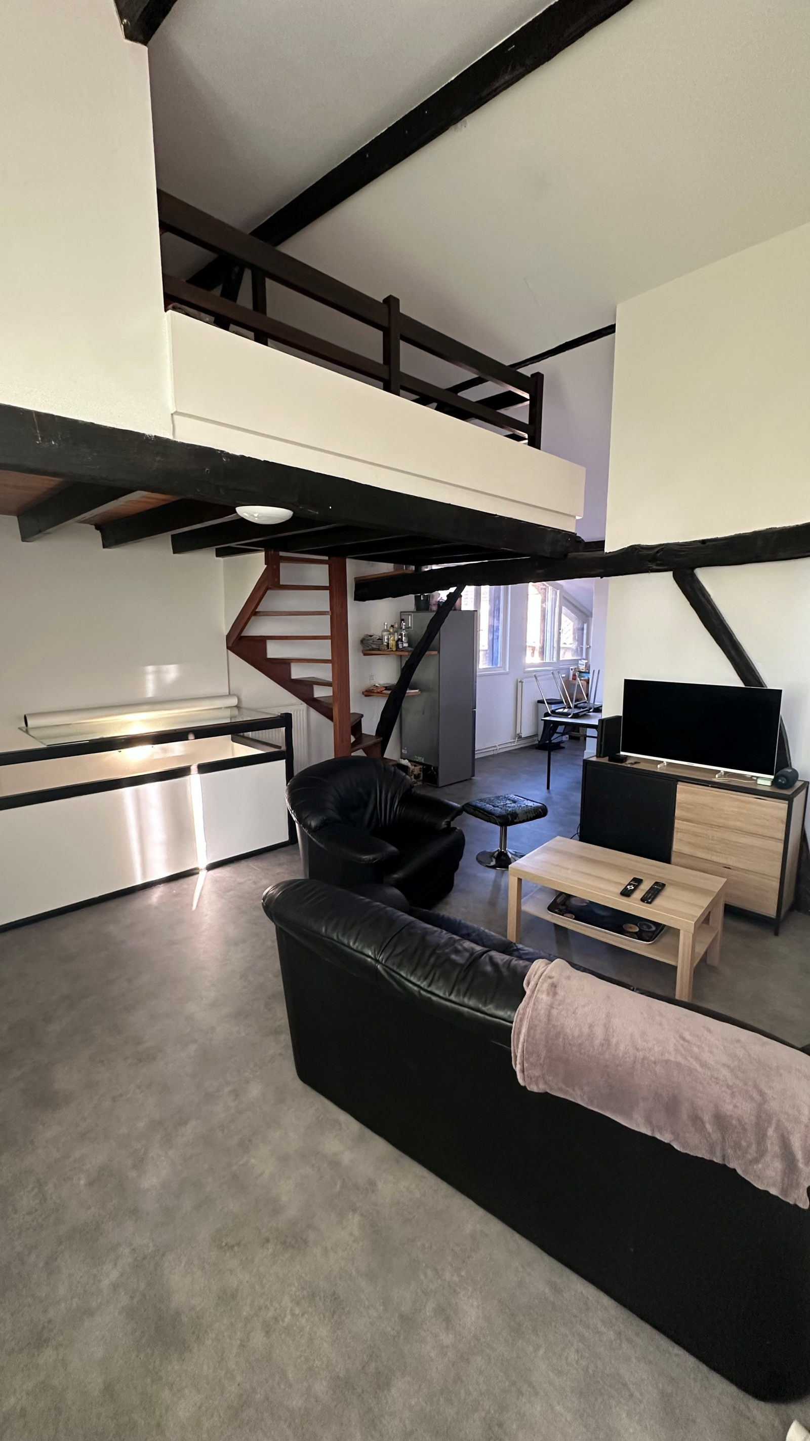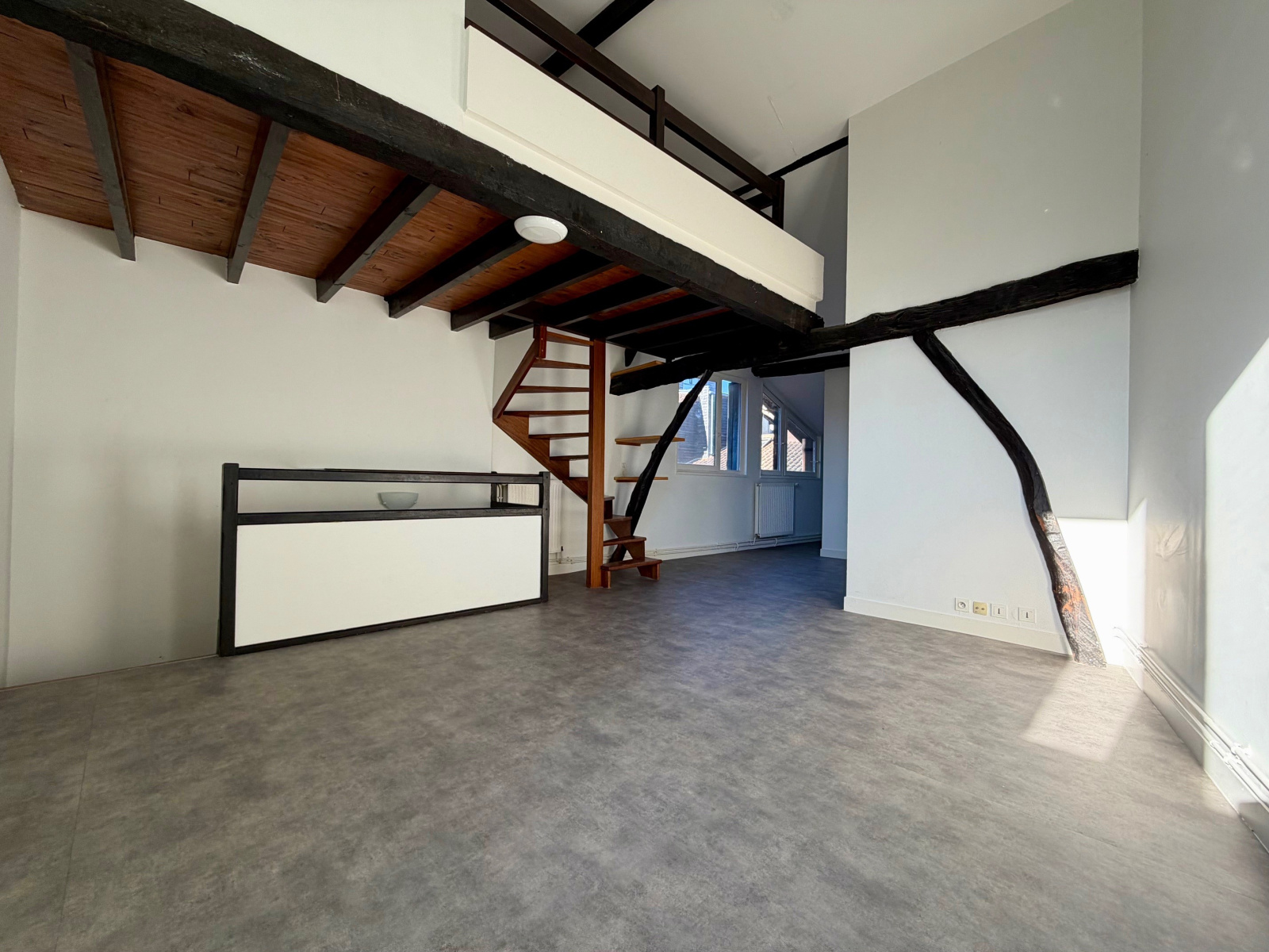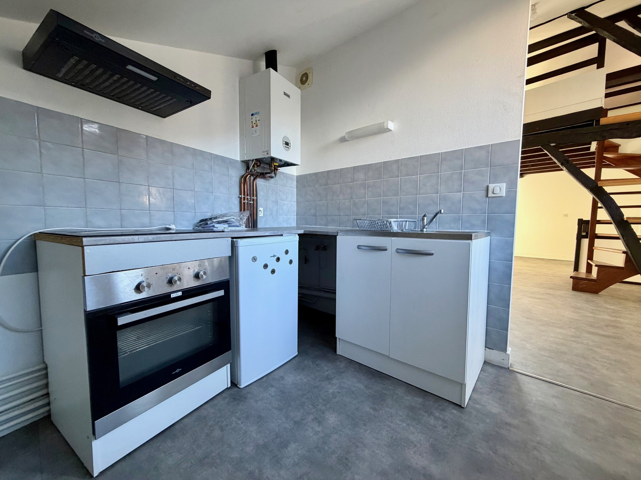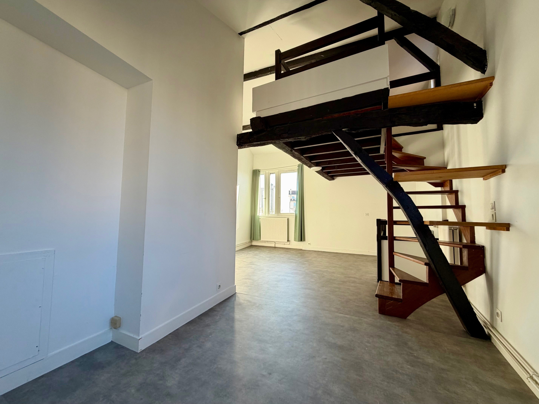 Place de la Barreyrette, charmant duplex à louer offrant entrée, séjour, cuisine, deux chambres, salle de bain, WC, mezzanine.